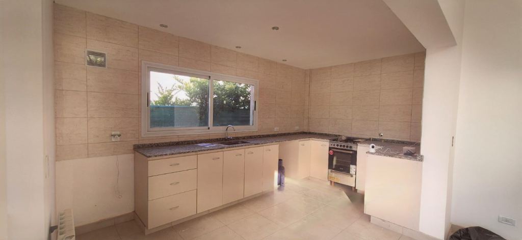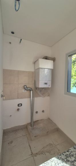 *Cocina comedor integrada: piso porcelanato, con bacha y mesada granito, muros revestidos en cerámico, bajo mesada en melamina, bacha simple mono comando, dos calefactores, por radiador, caldera, puerta ventana aluminio vidriado,